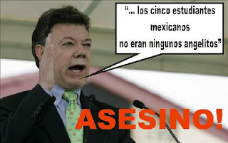 Este sábado 7 de agosto, Juan Manuel Santos, uno de los asesinos confesos de la masacre de Sucumbíos del 1° de marzo de 2008, tomará posesión del gobierno de Colombia para continuar con la política de guerra de Álvaro Uribe Vélez. Ambos personajes admitieron en medios internacionales su responsabilidad en la masacre donde fueron asesinadas 25 personas, entre ellas, cuatro estudiantes mexicanos: Verónica Velázquez, Soren Avilés, Fernando Franco y Juan González y, donde una más, Lucía Morett, resultó sobreviviente con graves heridas provocadas por esquirlas de bombas de racimo, mismas que utiliza el ejército estadounidense en Irak y que fueron arrojadas por el ejército colombiano en Sucumbíos.